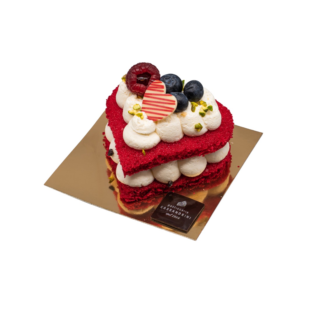 Biscuit alla vaniglia e cacao di colore rosso farcito con crema diplomatica, frutti rossi e una leggera granella di pistacchio. DISPONIBILE DALL' 8 FEBBRAIO