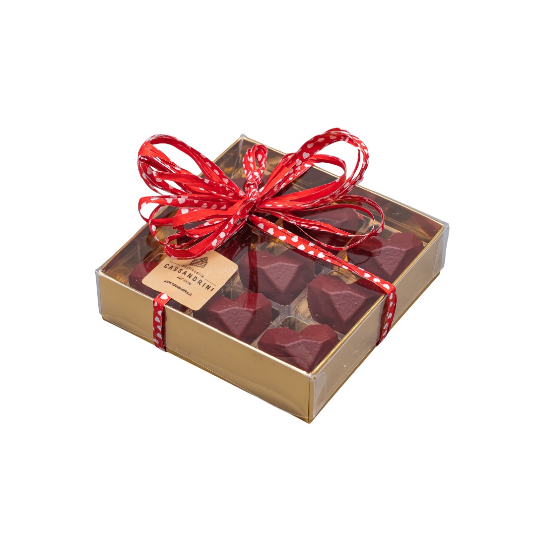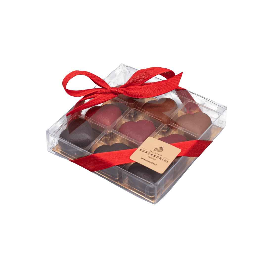 Scatolina con 9 cuoricini cioccolato al latte, fondente e bianco.