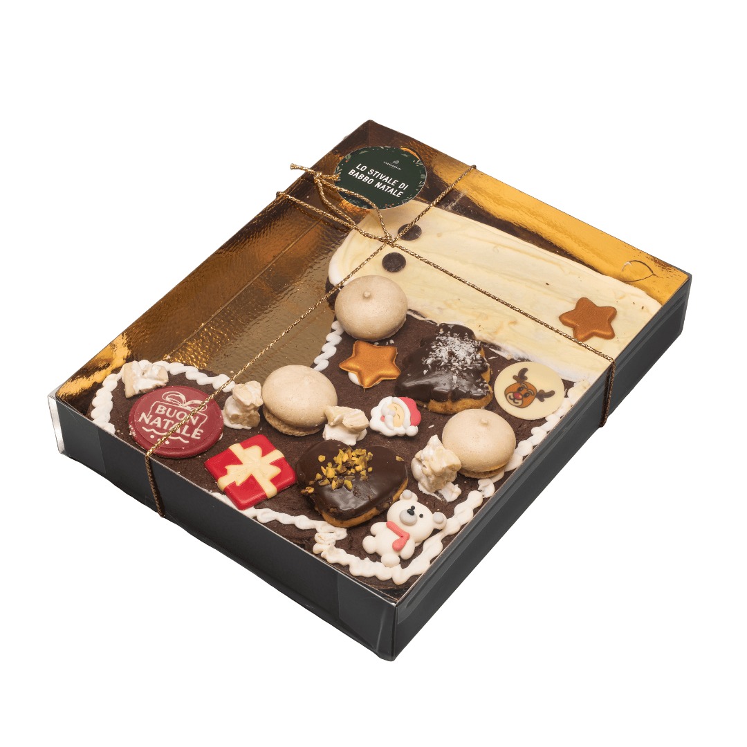 Stivale di babbo natale di pasta frolla al cacao arricchito con deliziose decorazioni in zucchero, cioccolato, meringhe e mandorlatini