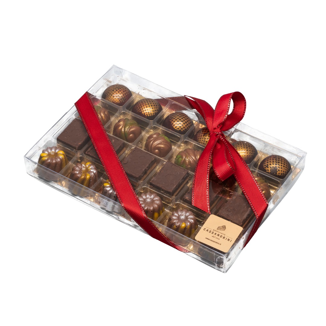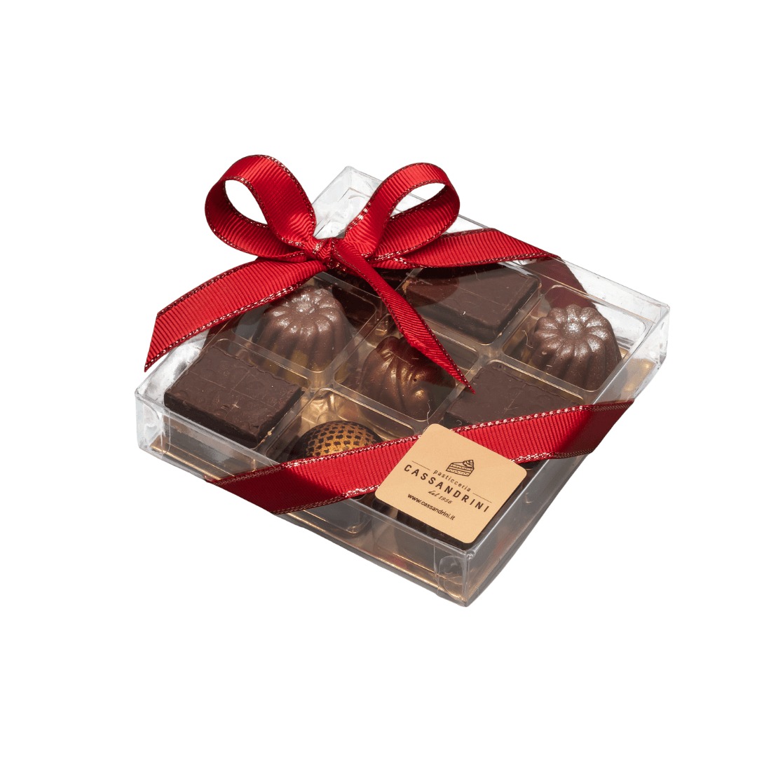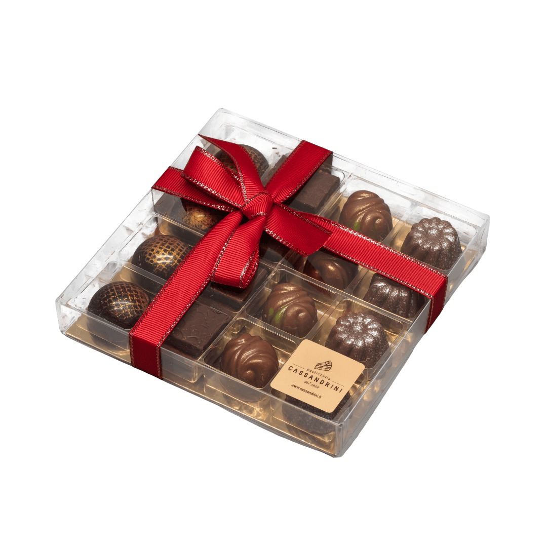 Deliziose praline al caramello e pralinato alle arachidi, cremino al pistacchio e riduzione di lampone, pralinato alle nocciole con riduzione al maracuja e cremino nocciola e fondente