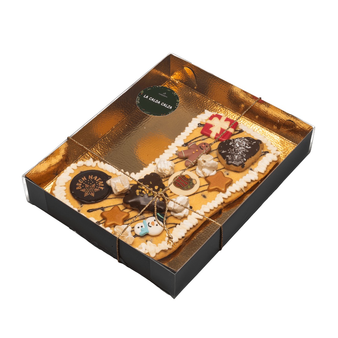 Calda calza frolla arricchito con deliziose decorazioni in zucchero, cioccolato, meringhe e mandorlatini