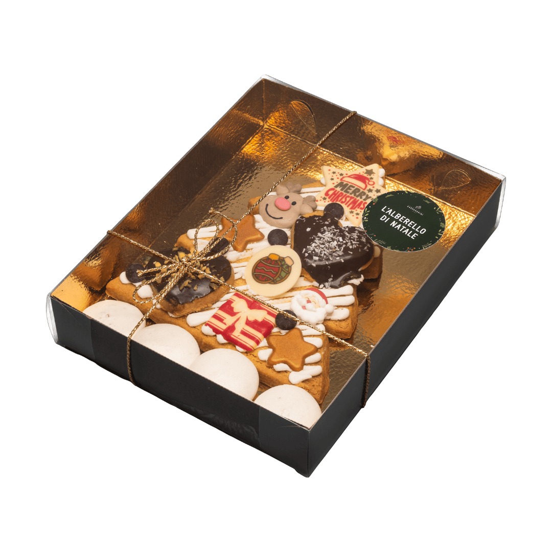 Alberello di Natale di pasta frolla classica con golose decorazioni in cioccolato, zucchero e meringhe con granella di nocciola