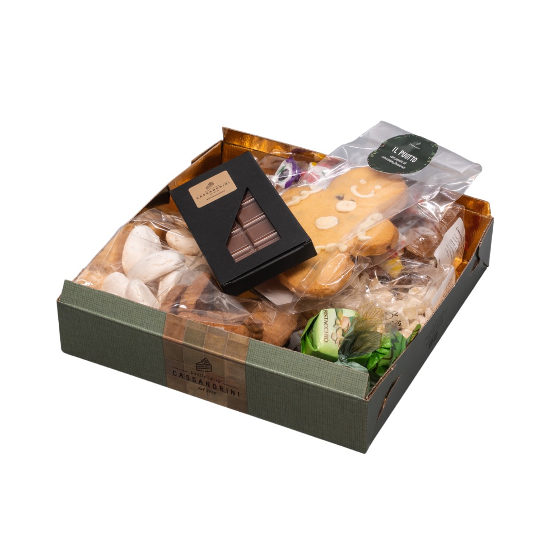 GELATINE ALLA FRUTTA, MERINGHETTE ARTIGIANALI, FROLLINI, CIOCCOLATONI RIPIENI, FIOCCHI DI MANDORLATO, TAVOLETTA DI CIOCCOLATO AL LATTE, PUOTTO DI FROLLA.