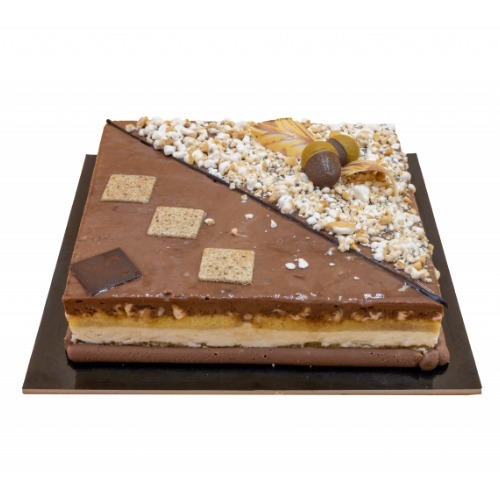 (4 - 6 persone) Delicato biscotto morbido tipo savoiardo con farina di riso profumato alla vaniglia farcito con una ricca crema diplomatica, mousse al cioccolato entrambe delattosate con residuo di lattosio inferiore allo 0,1% e granella di torrone.